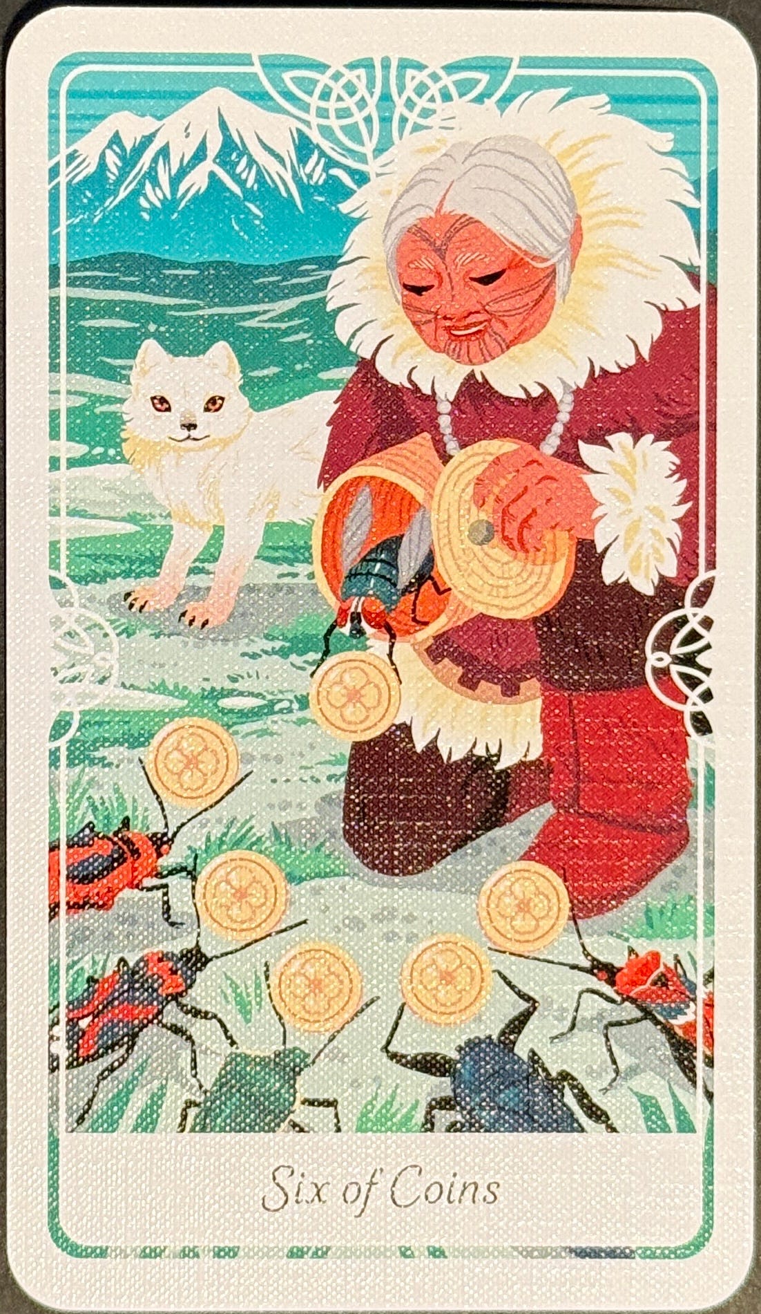 Six of Coins represents charity and kindness, the idea of paying it forward.