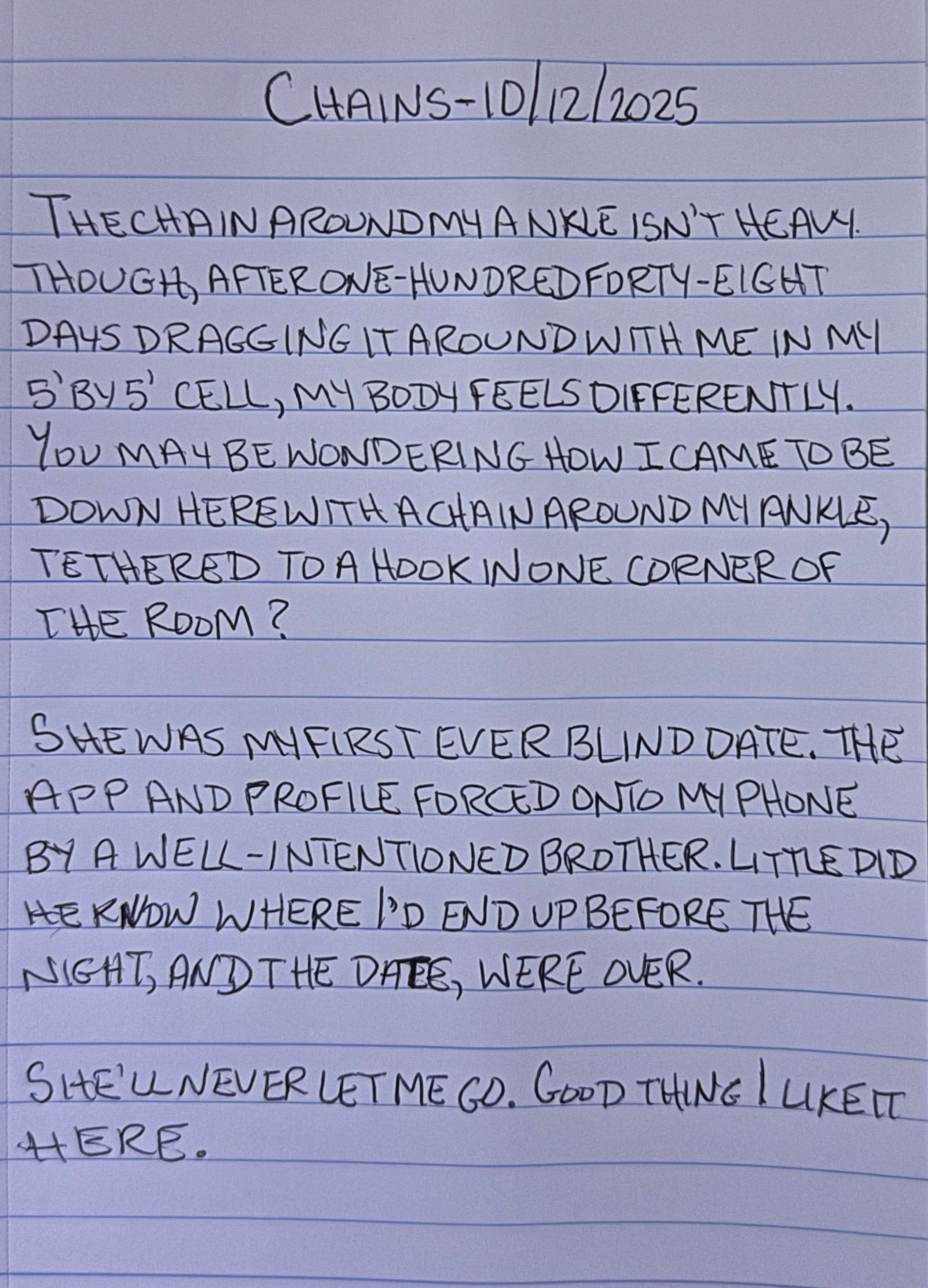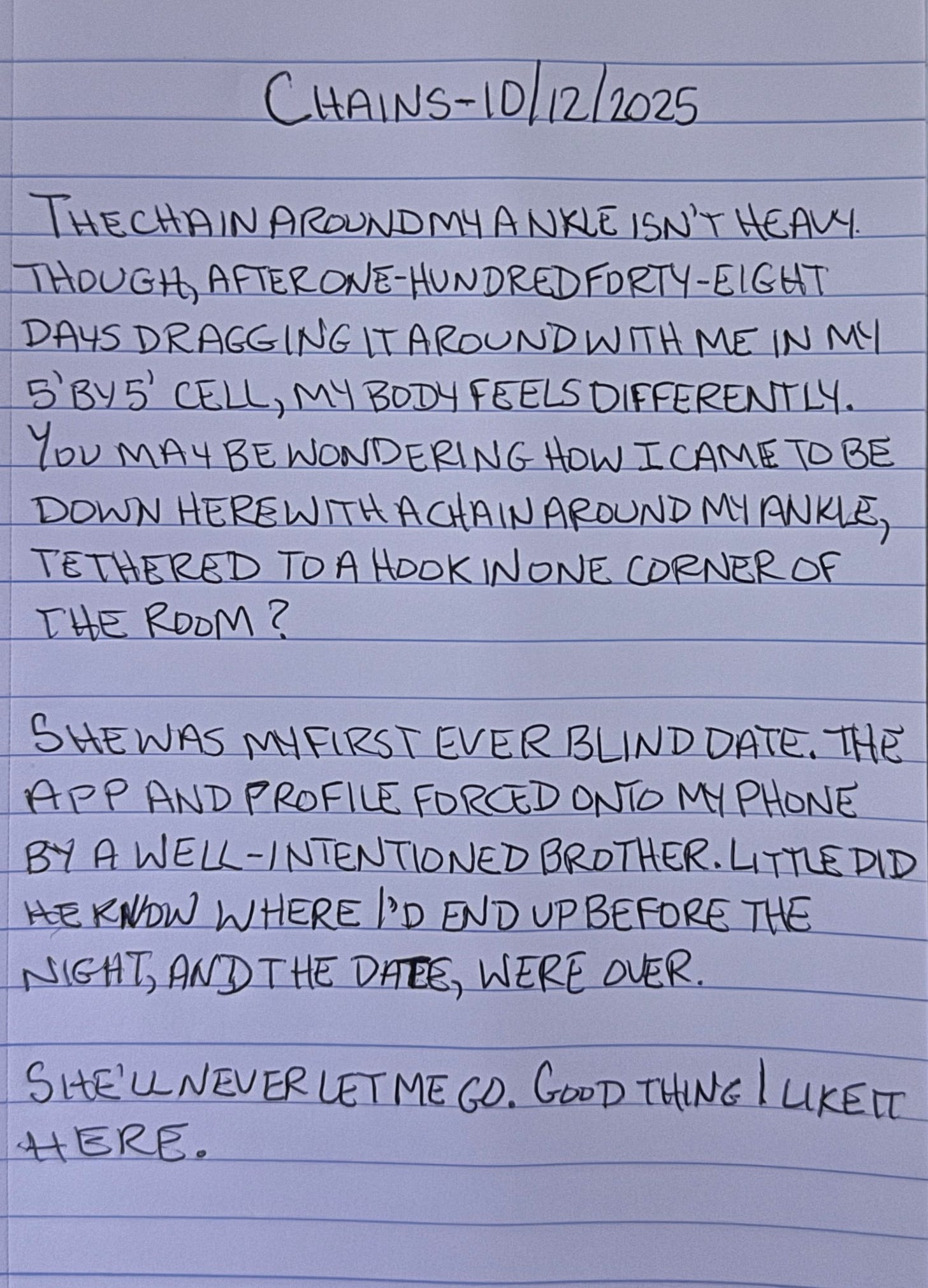 The chain around my ankle isn’t heavy though, after one-hundred forty-eight days dragging it around with me in my 5’ by 5’ cell, my body feels differently. You may be wondering how I came to be down here with a chain around my ankle, tethered to a hook in one corner of the room?