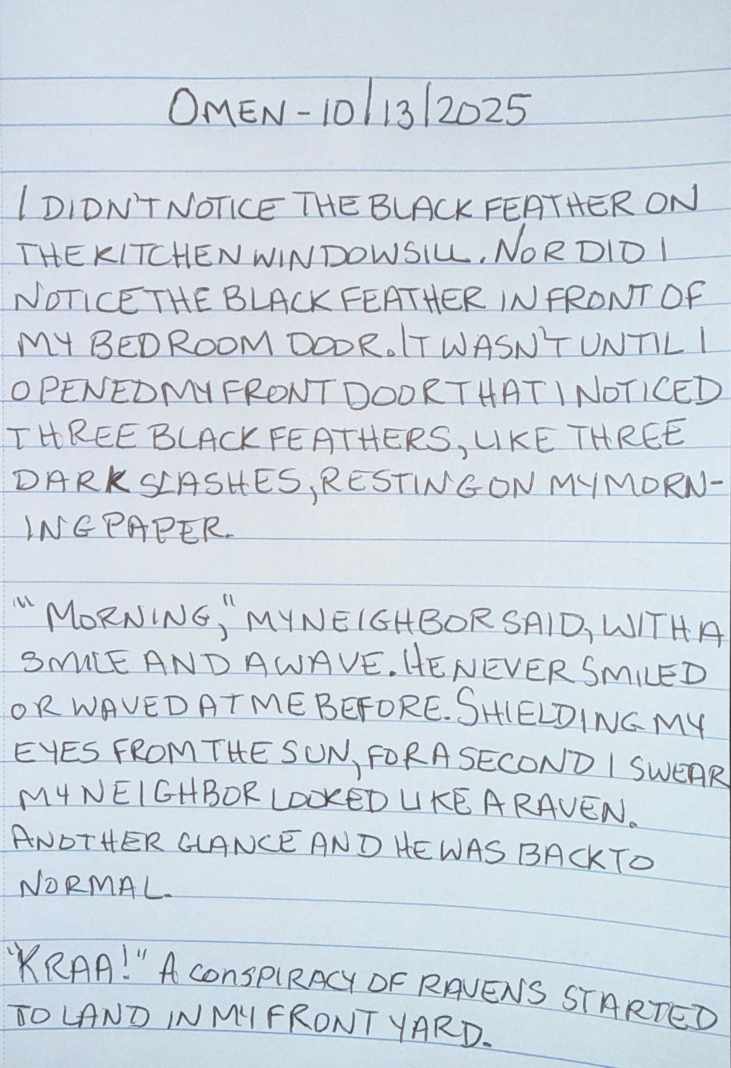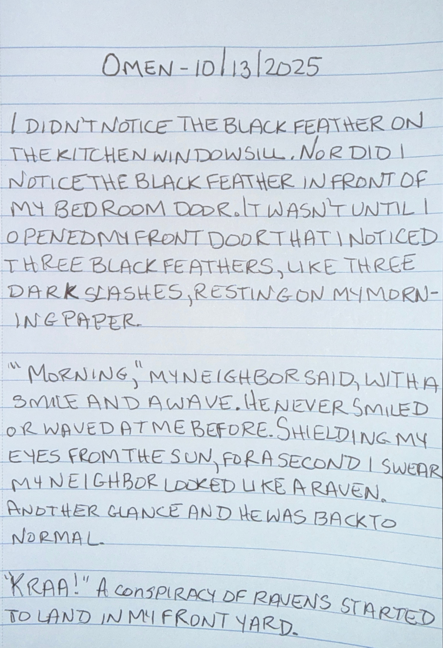 âMorning,â my neighbor said, with a smile and wave. He never smiled or waved at me before. Shielding my eyes from the sun, for a second I swear my neighbor looked like a raven. Another glance and he was back to normal.
