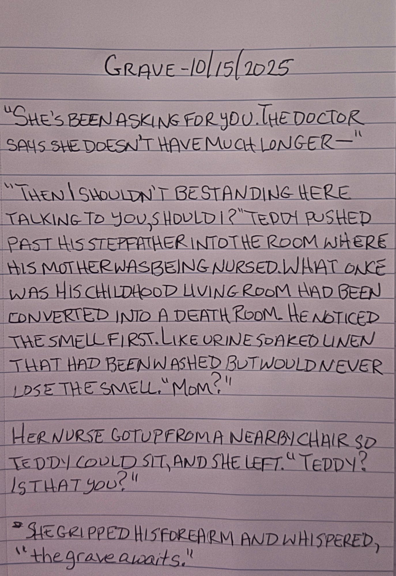 âThen I shouldnât be standing here talking to you, should I?â Teddy pushed past his stepfather into the room where his mother was being nursed. What once was his childhood living room had been converted into a Death Room. He noticed the smell first. Like urine soaked linen that had been washed but would never lose the smell. âMom?â