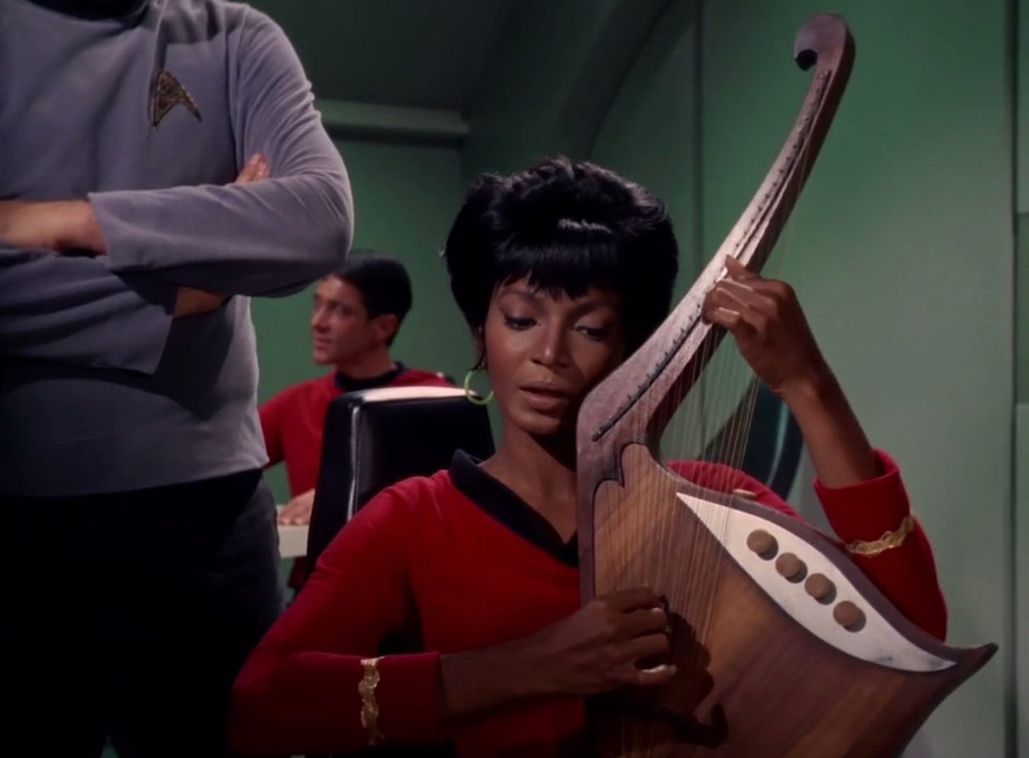 And now, for a brief interruption of our programming to bring you Lt. Uhura singing, again. I actually like that they’ve given her this thing that she’s known to do in the mess hall. At first it was creepy the way she was clearly going after Spock the first time, but now I appreciate this nuanced side it brings to her character. I wonder how many musical interludes we’ll have throughout the series?